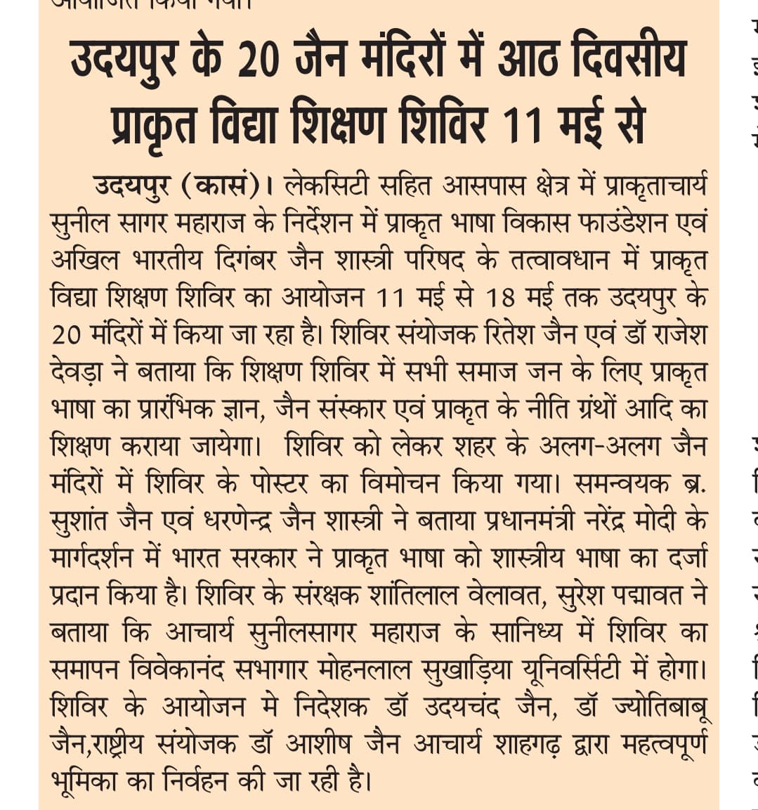 Prakrat Bhasha ka adhyayan Kiya man Pata Chala Ki is bhasha mein Shastra Granth Hain isliye Padhne Mein manchne mein adhyayan karne mein Mushkil Nahin Aaegi Kyunki Maine prakrat Bhasha ka Vachan Kiya aur prakrutik Bhasha ko samajhne ke liye bhaiya Ji Ne yah Shivir Lagaya aur usko Dekhkar yah laga ki Aage Bhi aath Din Mein Jo Nahin padh Paya vah Aage Bhi padhna chahie aur Dharm ka prachar Prasar ho sake isase bacchon mein prakrat bhasha Chhote Se Hi samajh sake Mujhe Shivir mein bahut Achcha Laga
